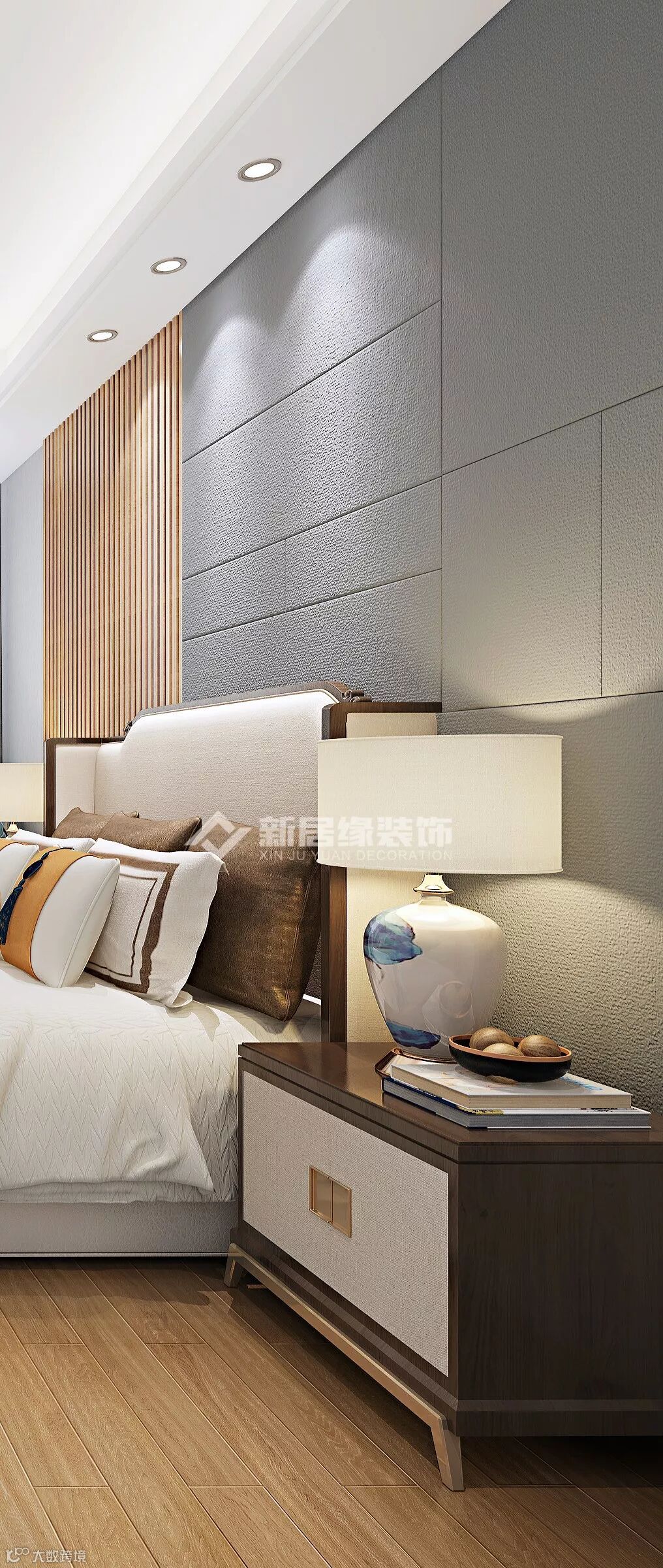 原木地板、灰色背景、白色床品