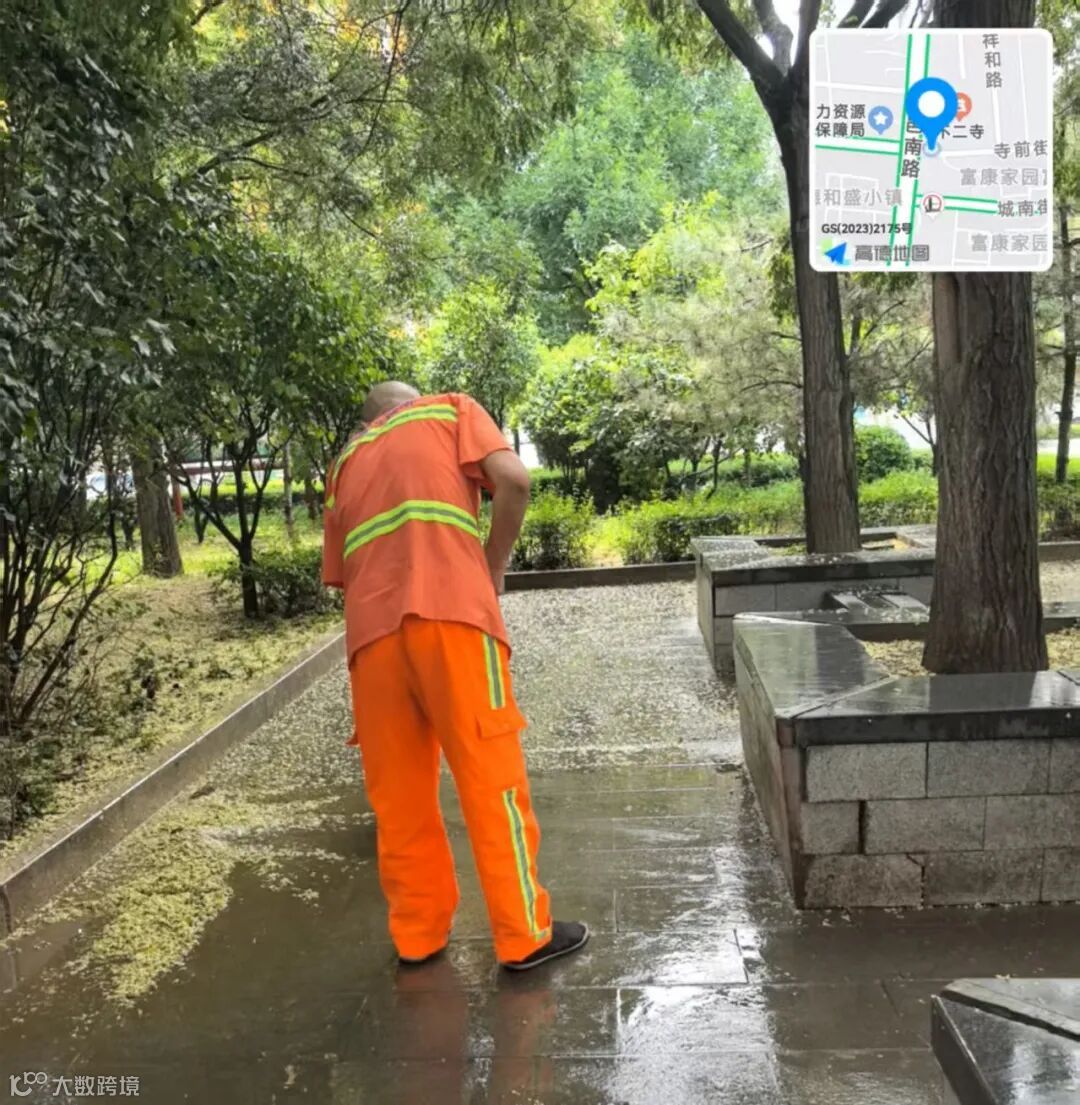 有时候,天气也会给环卫工人们出难题。一场突如其来的春雨,让原本就难清理的槐花变得更加湿滑和黏腻。雨水打在环卫工人们的身上,模糊了他们的视线,但他们的脚步却依然坚定。