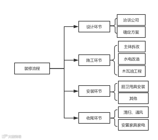 装修可以大致分为四个环节,分别是:设计环节、施工环节、安装环节、收尾环节。