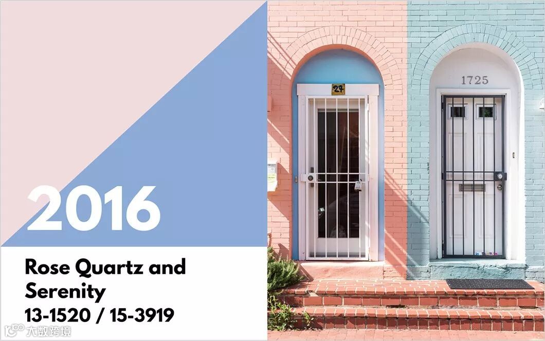 偏向柔和的色彩手法:Pantone公司首度选择两种色的组合作为代表是—2016年的年度代表色是宁静蓝与水晶粉。