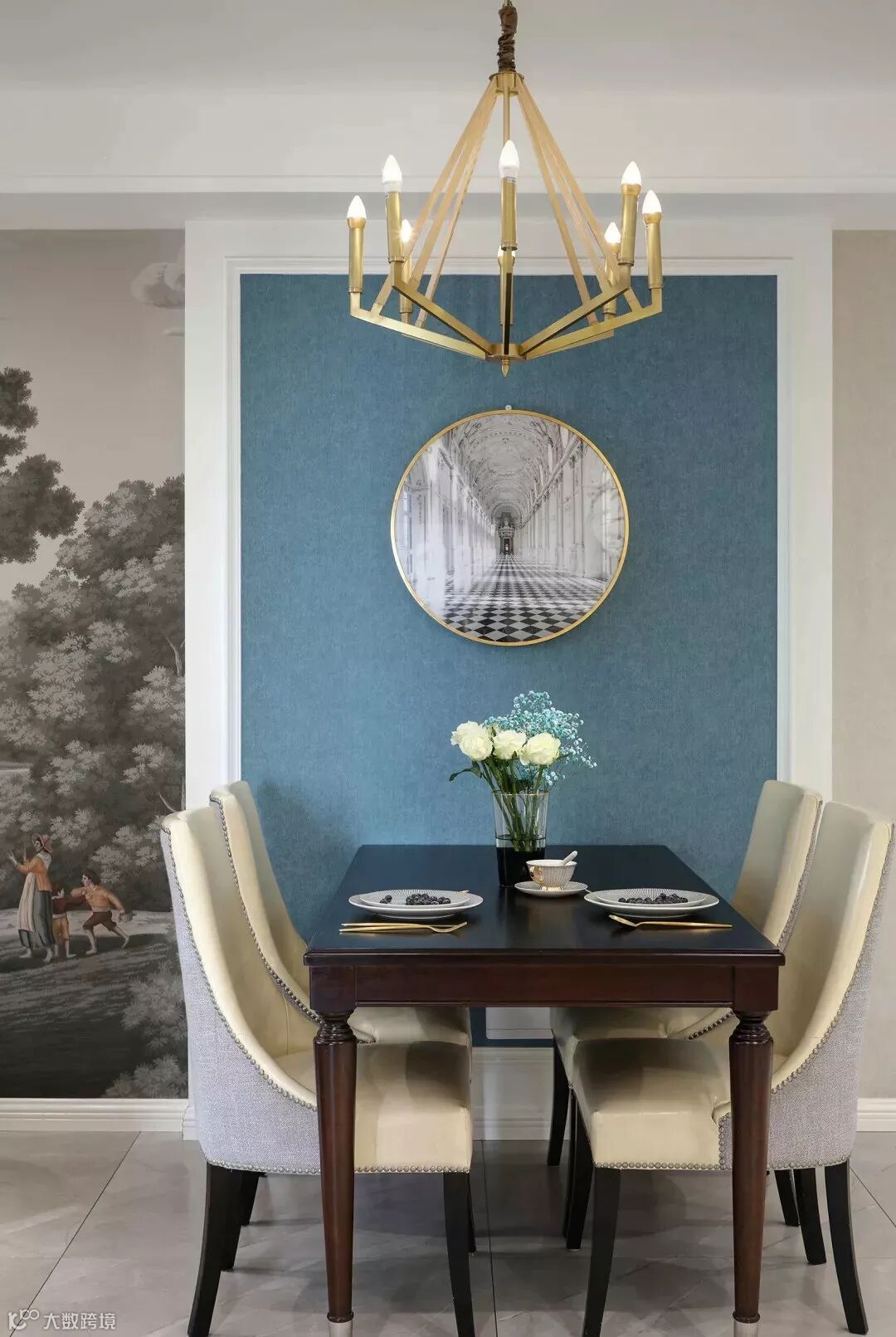 餐厅设计了立体感的设计造型,搭配蓝色背景,餐桌摆上鲜花,给空间添上一丝娇美。用餐的愉悦,源于对细微处的每一刻享受。