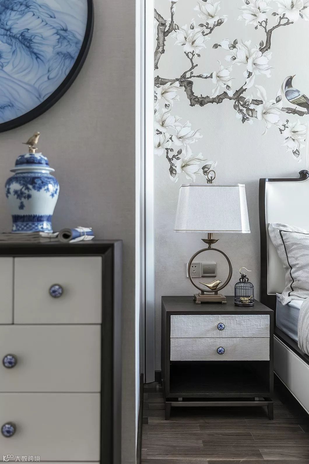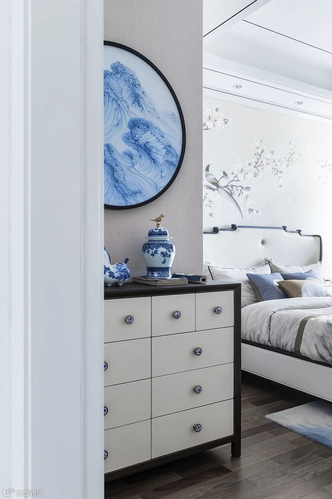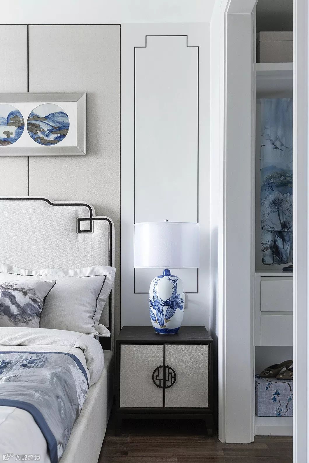 床头素色清雅的青花瓷装饰画