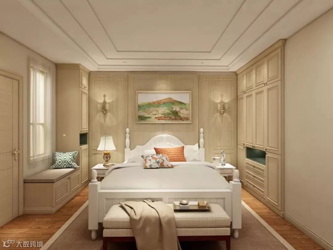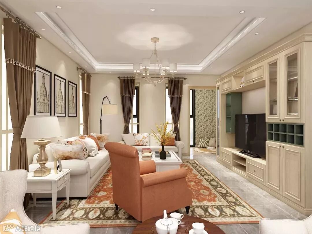 从户型来看,客厅的采光是非常好的,客厅是美式风格设计,电视墙正面设计为柜体,考虑的户型面积,这样给生活收纳增大了空间,地面的灰色地砖使整个空间质感满满。