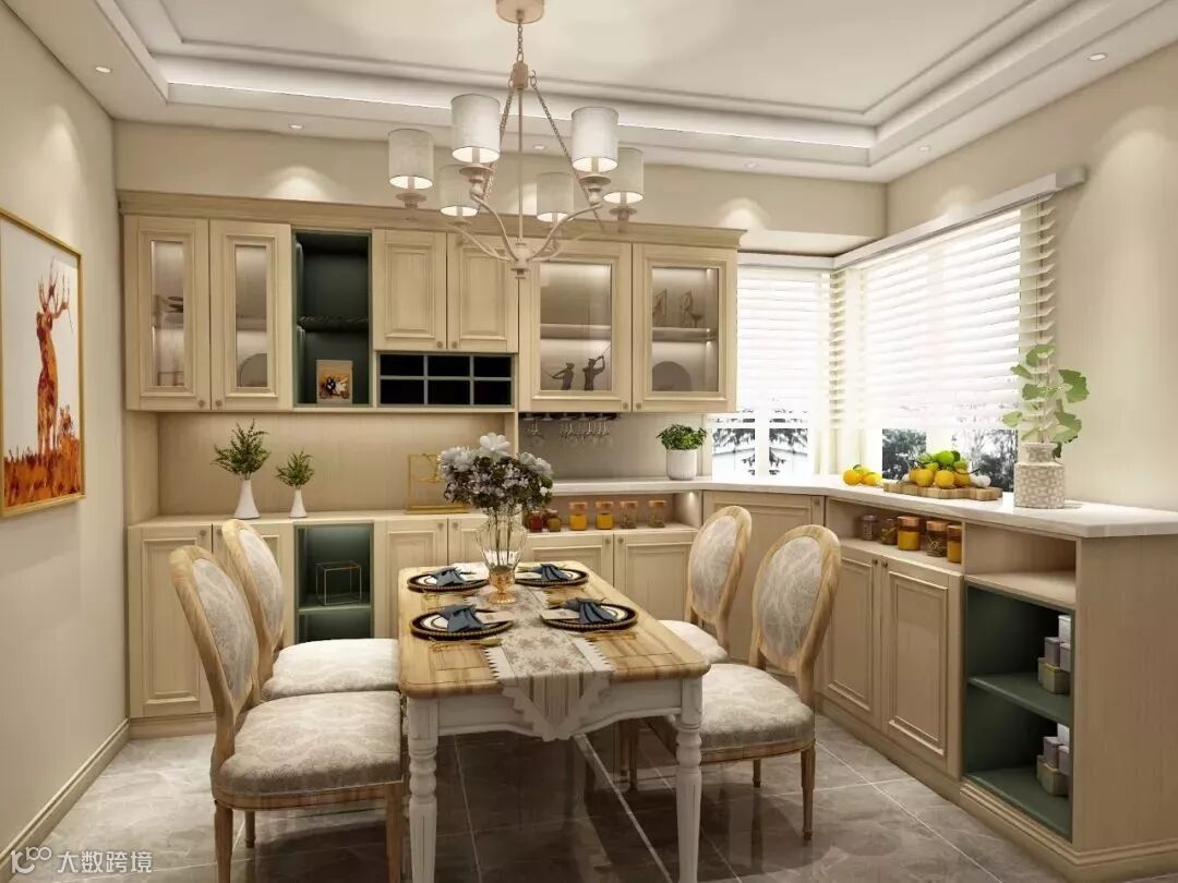 餐柜的吧台上摆放一些绿植,增添了一份生机。温暖的空间色调,每天在这里享受用餐的美好时光。
