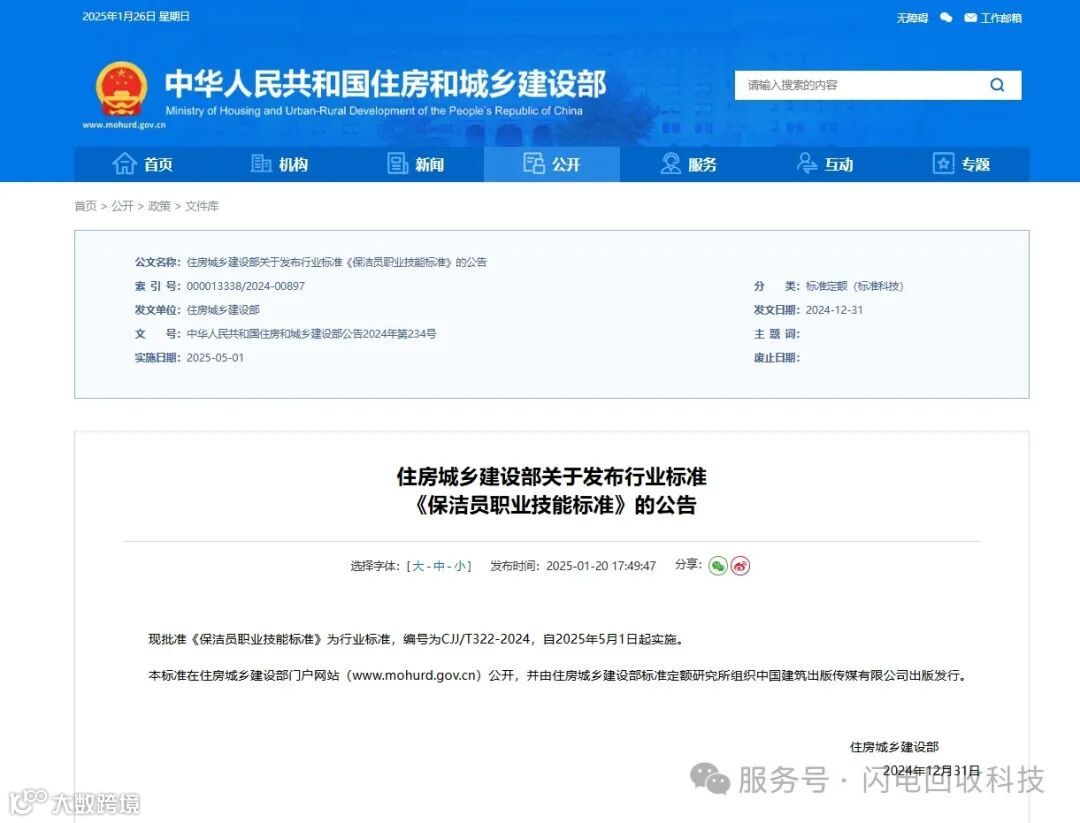 环卫工人们注意啦!住建部网站最近发布一则重要公告,《保洁员职业技能标准》(CJJ/T322 - 2024)已正式获批成为行业标准,并且将于 2025 年 5 月 1 日起开始实施。这一消息,无疑给环卫行业带来了新的发展契机!
