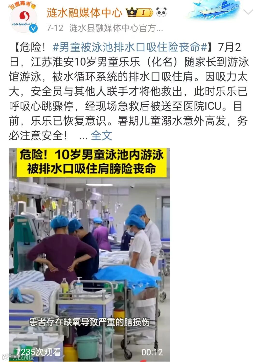 7月2日,江苏淮安10岁男童乐乐(化名)随家长到游泳馆游泳,被水循环系统的排水口吸住肩。因吸力太大,安全员与其他人联手才将他救出,此时乐乐已呼吸心跳骤停,经现场急救后被送至医院ICU。经抢救,乐乐已恢复意识。