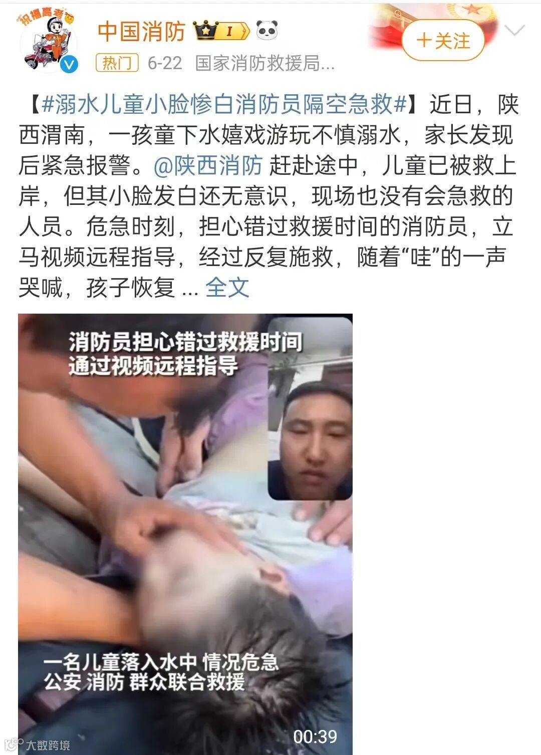 近日,陕西渭南市发生了一起溺水事件:一名孩童在游玩时不慎溺水。家长发现后立即报警,陕西消防接到报警后迅速赶赴现场。消防员到达时,孩子已被救上岸,但面色苍白且失去意识,现场没有专业急救人员。面对紧急情况,消防员通过视频远程指导家长进行急救。经过反复施救,终于恢复了意识。