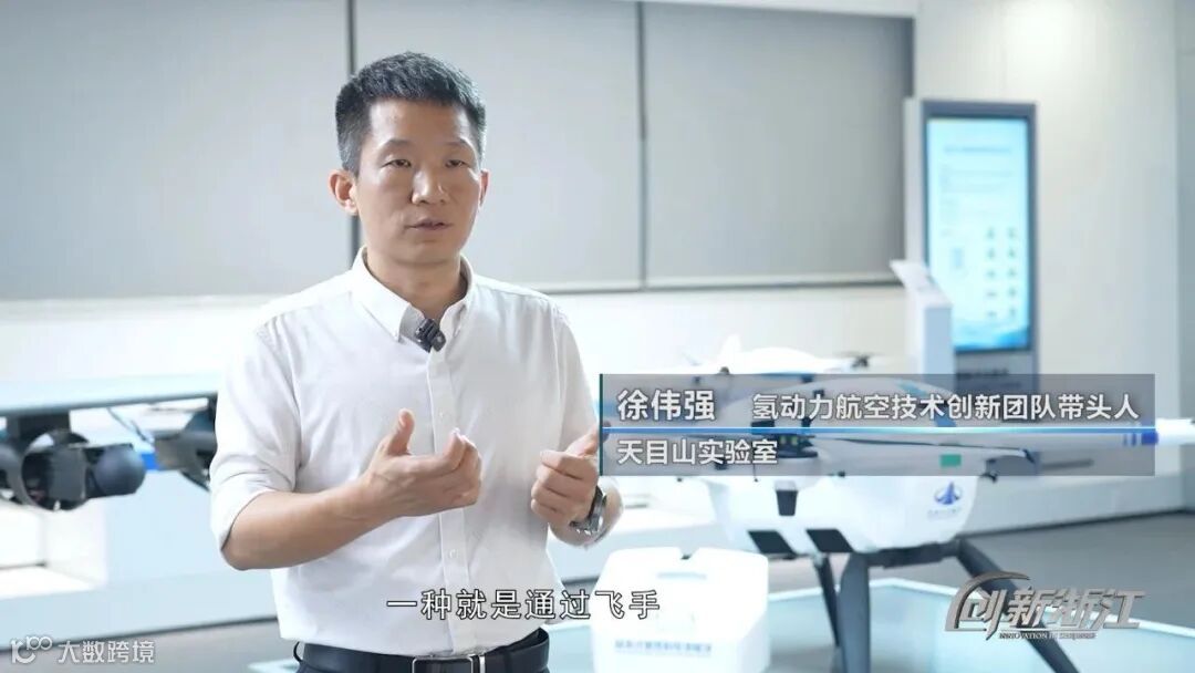 在天目山实验室的成果展厅里,氢动力航空技术创新团队带头人徐伟强正向记者介绍其团队最新研发的氢动力多旋翼无人机——“天目山一号”2.0版 AI智能氢动力长航时无人机,该机型是全球首款支持燃料电池模块化快速拆装的氢动力无人机,也是全球首款搭载AI大模型实现“端-边-云”智能管控的氢动力无人机,具备一键自主起降、100公里超视距连续作业能力。