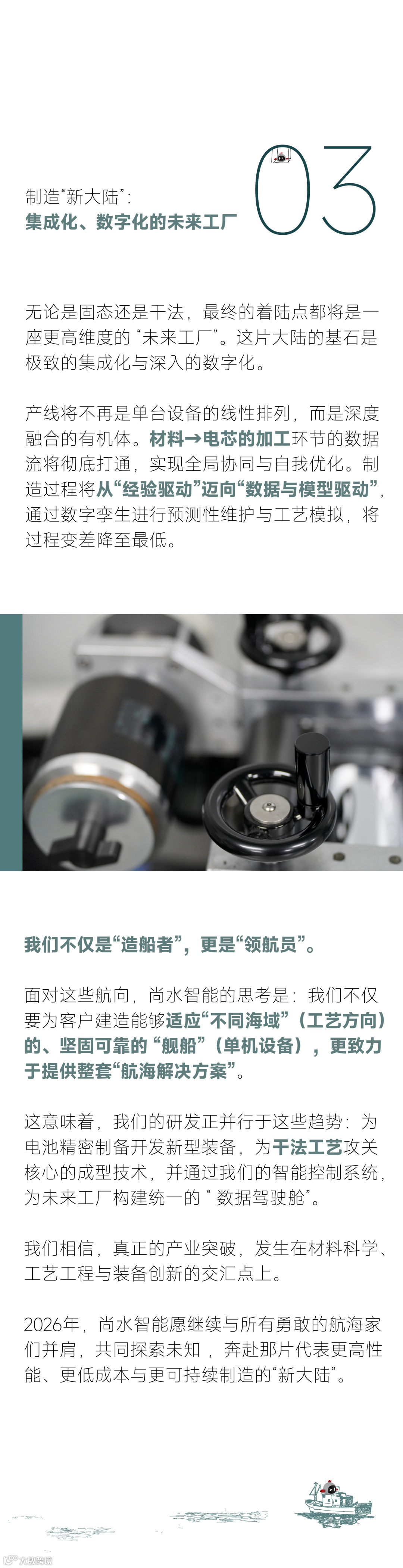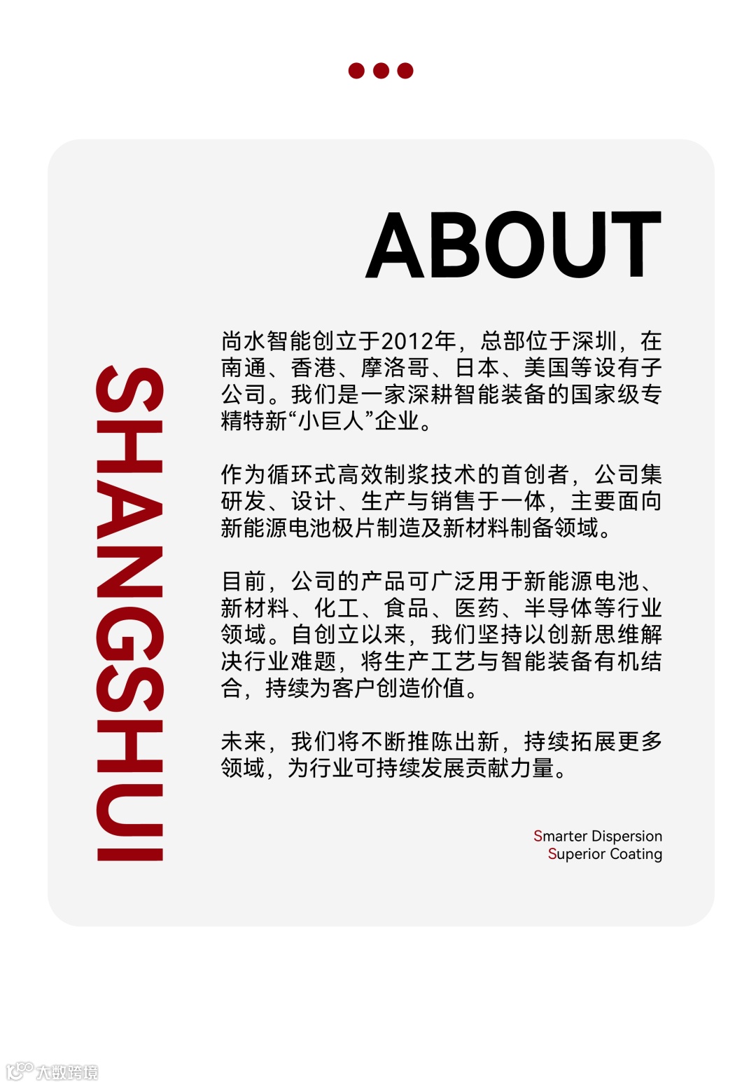 尚水智能创立于2012年,是一家深耕智能装备的创新型企业。公司集研发、设计、生产与销售于一体,专攻新能源电池极片制造及新材料制备领域。目前,公司产品可广泛用于新能源电池、新材料、化工、食品、医药、半导体等行业领域。