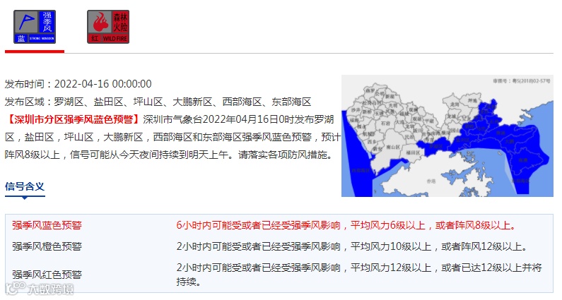 深圳市分区强季风蓝色预警生效