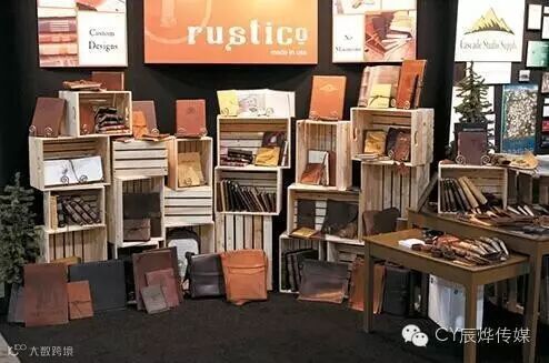 公司名称是鲁斯蒂科皮革,当然展会也不会做得光滑而有光泽,这就是为什么在促销产品协会国际博览会上鲁斯蒂科选择了这个质朴的风格。跨越一个10×10的空间,在斜后方的位置,弯曲的黑墙附带灯具挂着三个面板,明确该公司的名称和产品。但是观众的目光很快会被吸引到放在黑色地毯上的20个箱子,箱子里边和上边都会得到关注。鲁斯蒂科也展示了皮革装订的杂志和众多手袋样品。