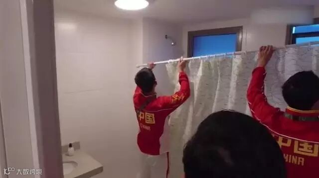 这是中国乒乓队在里约奥运村房间,运动员们首先要做的不是训练,而是维修浴室的浴帘杆