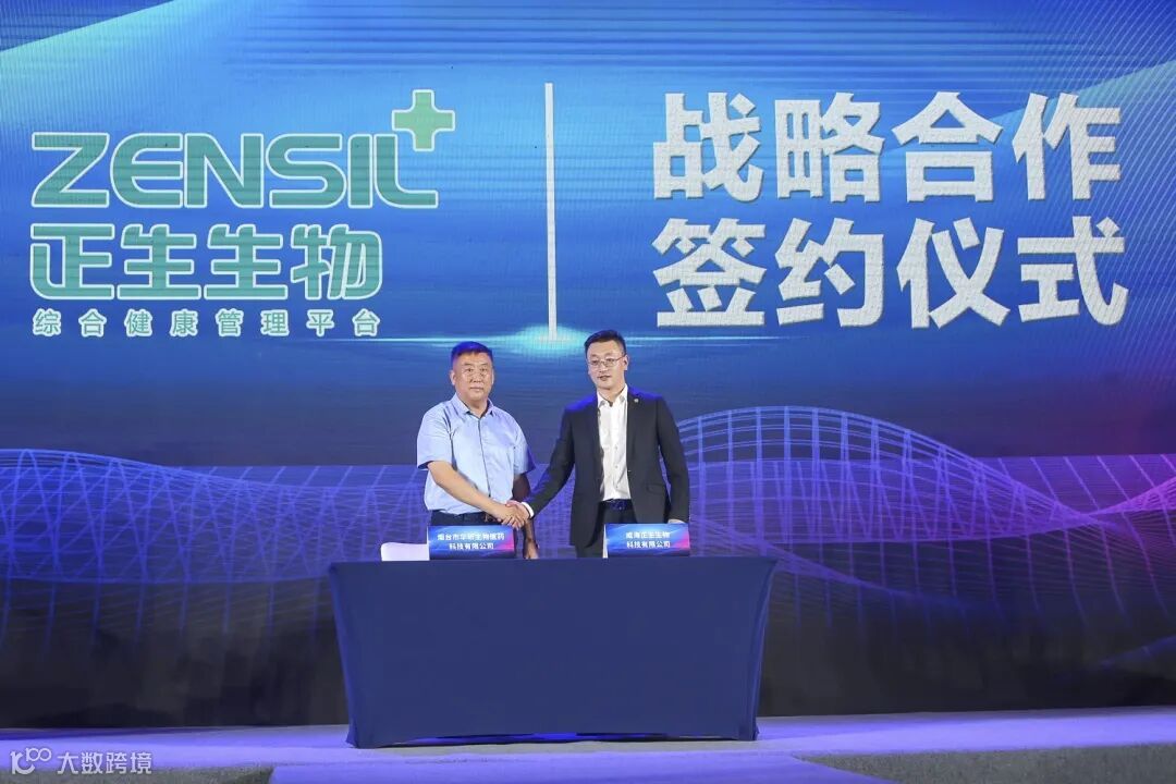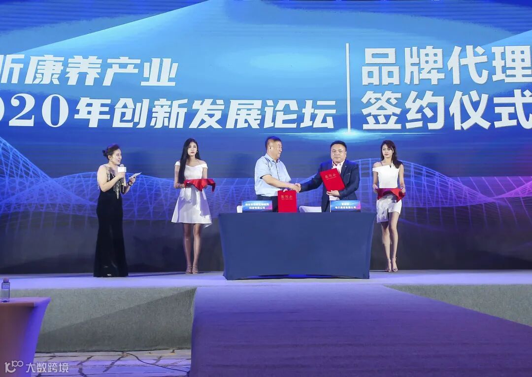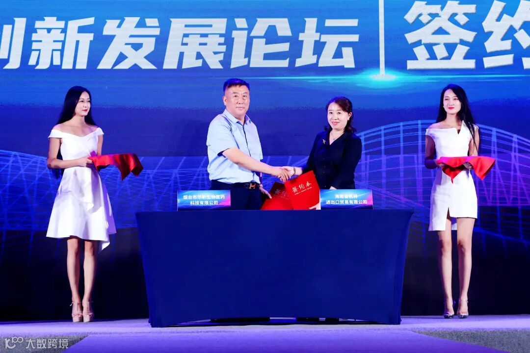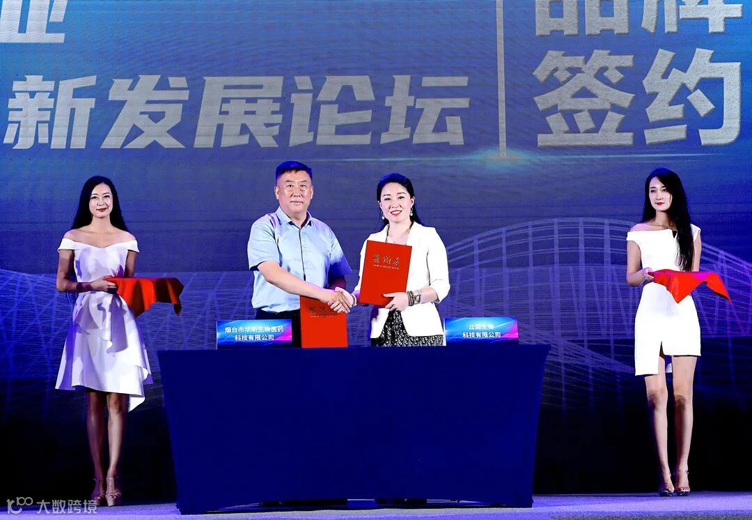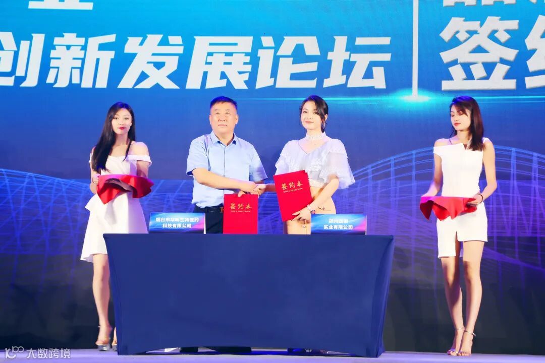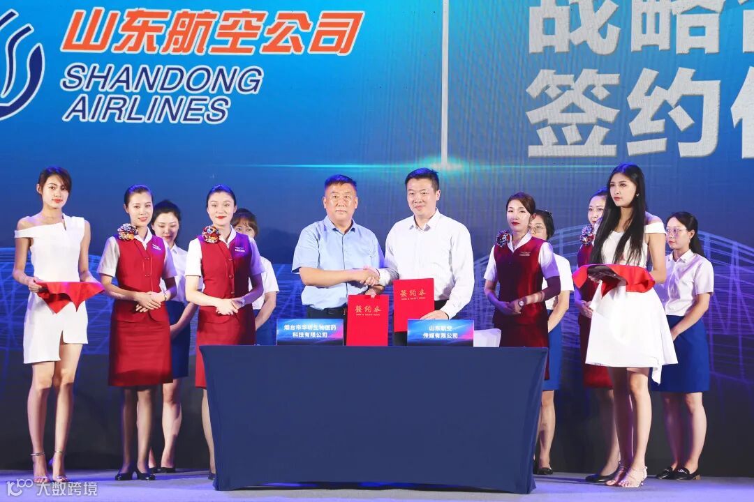 李董事长发言结束后,烟台市华昕生物医药科技有限公司和威海正生生物科技有限公司就康养产业项目举行了战略合作签约仪式,并与山东航空传媒有限公司就品牌推广达成战略合作