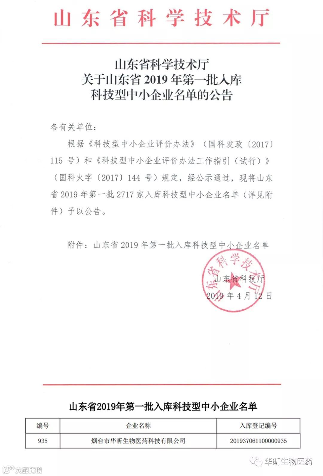 近日,烟台市华昕生物医药公司被认定为“科技型中小企业”,入库登记编号为“201937061100000935”,这是我们在科研创新方面取得突破性的荣誉,标志着我公司的科研创新能力又迈上了一个新的台阶。
