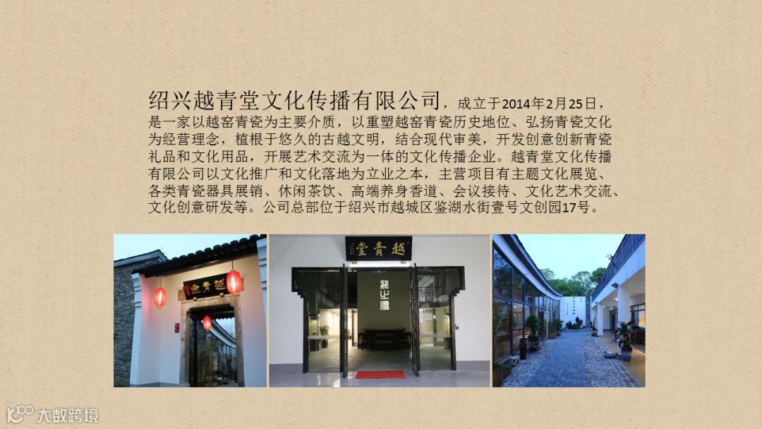 绍兴越青堂文化传播有限公司,成立于2014年2月25日,是一家以越窑青瓷为主要介质,以重塑越窑青瓷历史地位、弘扬青瓷文化为经营理念,植根于悠久的古越文明,结合现代审美,开发创意创新青瓷礼品和文化用品,开展艺术交流为一体的文化传播企业。越青堂文化传播有限公司以文化推广和文化落地为立业之本,主营项目有主题文化展览、各类青瓷器具展销、休闲茶饮、高端养身香道、会议接待、文化艺术交流、文化创意研发等。公司总部位于绍兴市越城区鉴湖水街壹号文创园17号。