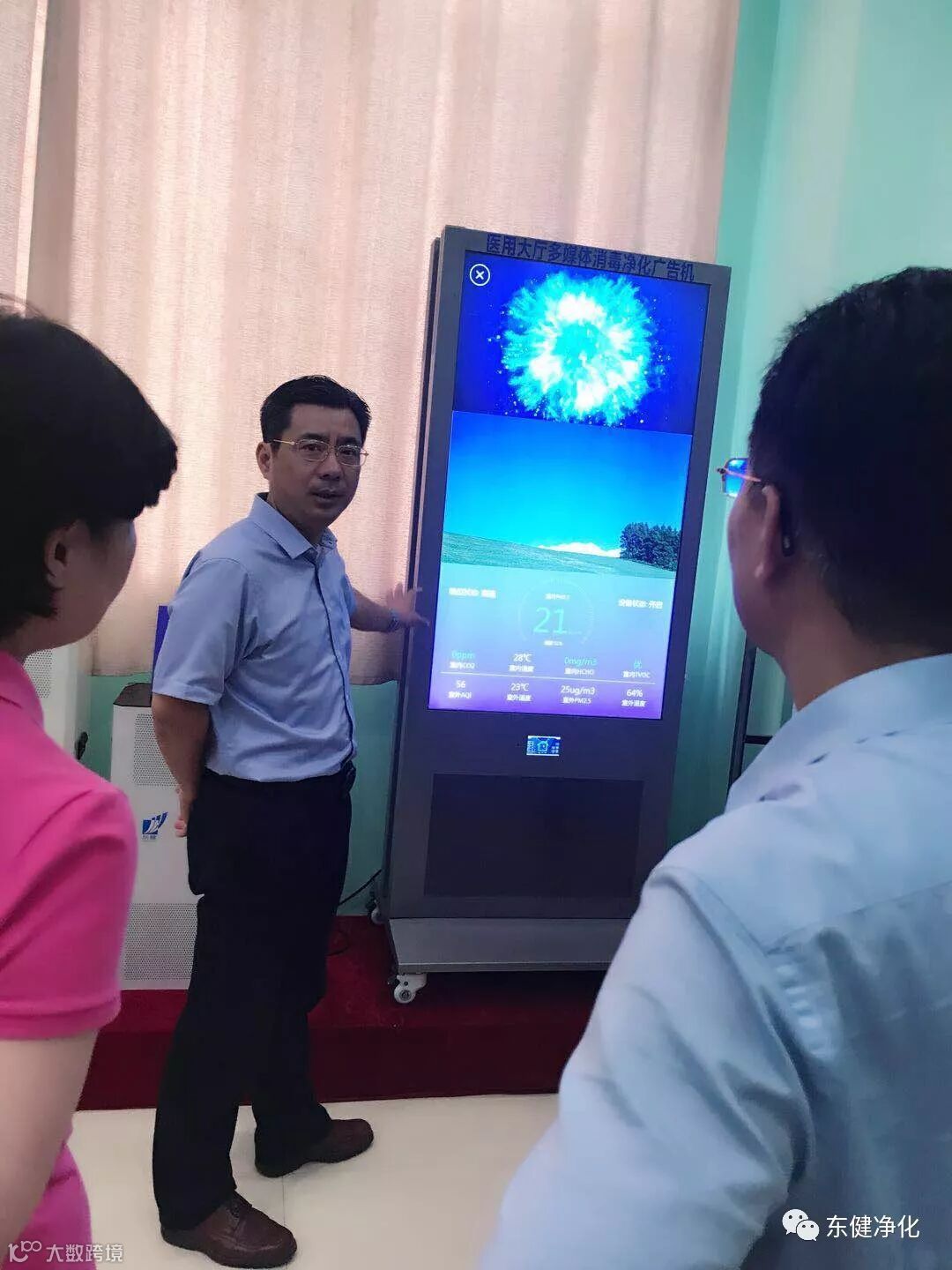 东鳄公司副总经理杨小明带张书记一行参观了公司的产品展示厅,并向张书记就产品做了详细的介绍,张书记对公司研发的多媒体空气净化机和手术室节能环保产品高度赞赏。