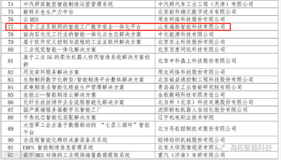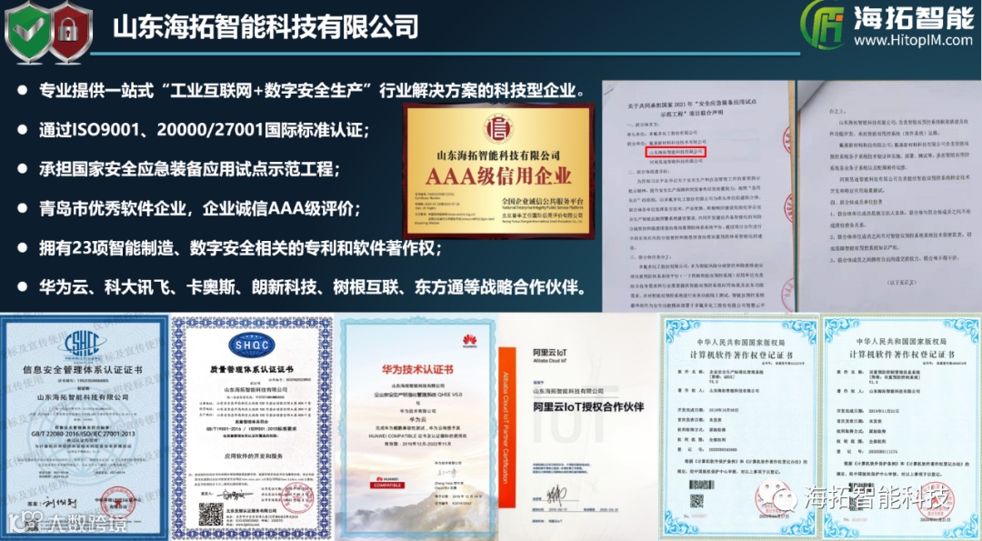 海拓智能是专业从事工业信息化研究、开发和应用的高新技术企业。公司符合GB/T19001-2016质量体系标准要求,产品符合ANSI/ISA95、ISO27001国际标准,拥有30余项软件著作权、软件认定产品证书及多项专利,参与完成多项国家科技部、应急管理部、省科委相关课题,承担了“国家应急装备示范试点工程”项目。