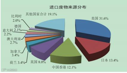 依据近十年的统计数据,我国进口的废物主要来自美国、日本、英国、欧盟、中国香港等发达国家和地区。其中,中国香港作为贸易自由港的特殊地位,主要以转口贸易为主。以2014年为例,美国、英国、日本和加拿大是废纸进口的主要来源国,合计占废纸进口总量的74.4%;废塑料进口主要来自香港、日本、美国和德国,合计占废塑料进口总量的65.5%;废五金进口主要来自日本、香港、美国和马来西亚,合计占废五金进口总量的80.2%;氧化皮,俗称氧化铁皮,进口主要来自印度、泰国、印度尼西亚、巴基斯坦、土耳其和埃及,合计占氧化皮进口总量的59.6%;铝废碎料进口主要来自美国、香港、马来西亚、澳大利亚和英国,合计占铝废碎料进口总量的85. 8%;铜废碎料进口主要来自美国、英国、墨西哥、德国和香港,合计占铜废碎料进口总量的56.4%;废船进口主要来自印度尼西亚、巴拿马、澳大利亚、阿曼、韩国和新加坡,合计占废船进口总量的55.9%;废钢铁进口主要来自美国、日本、香港和澳大利亚,合计占废钢铁进口总量的89.9%。