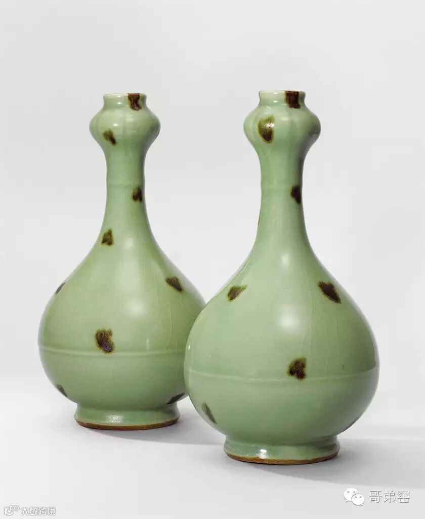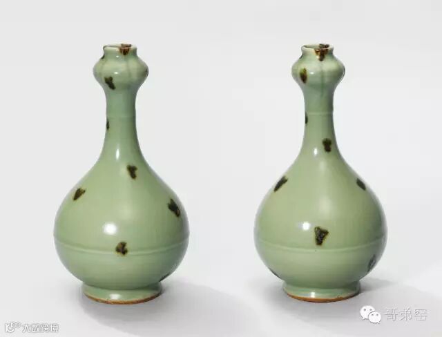 Lot 3133 元代龙泉窑 点彩褐斑蒜头瓶一对