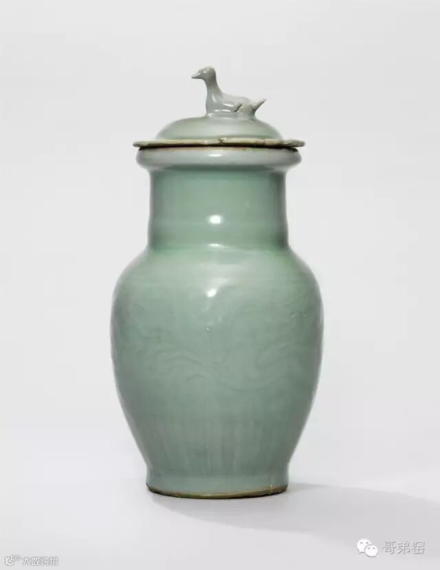 Lot 716 南宋龙泉窑 青釉刻花卉纹鸟形钮盖罐
