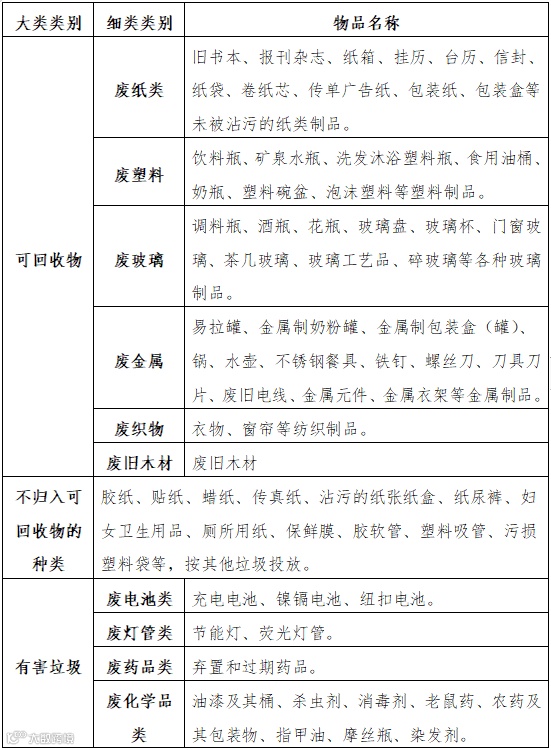 可回收物指适宜回收和资源利用的废弃物,包括废弃的玻璃、金属、塑料、纸类、织物、家具、电器电子产品和年花年桔等;