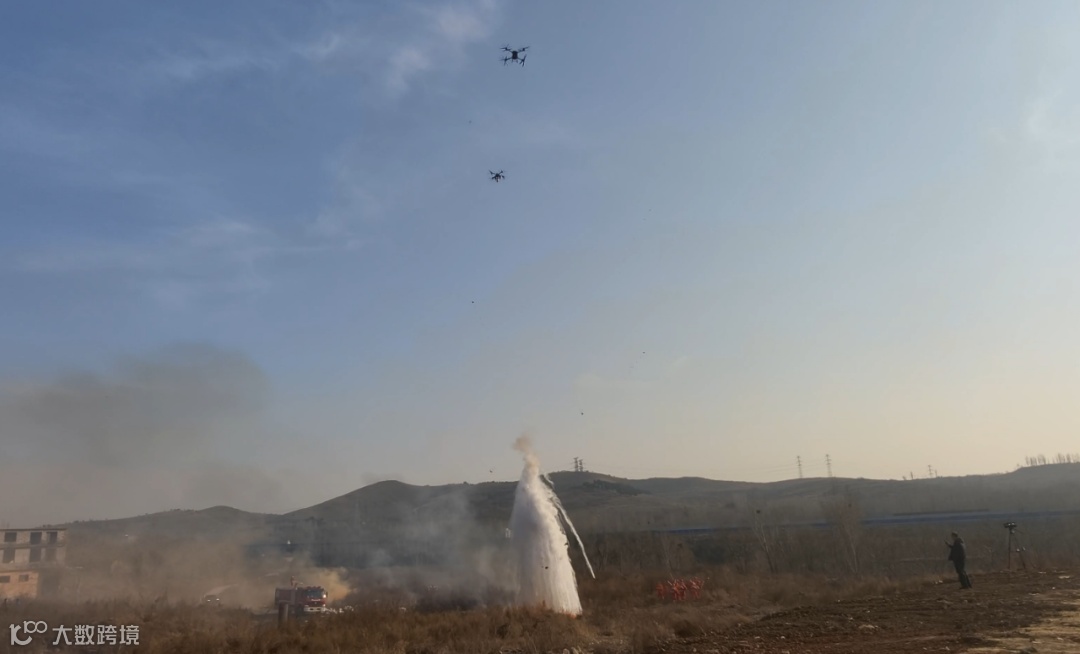 本场演练共设置八大环节。在空地配合灭火环节,由山东雷纳演示无人机定点精确抛投灭火弹。