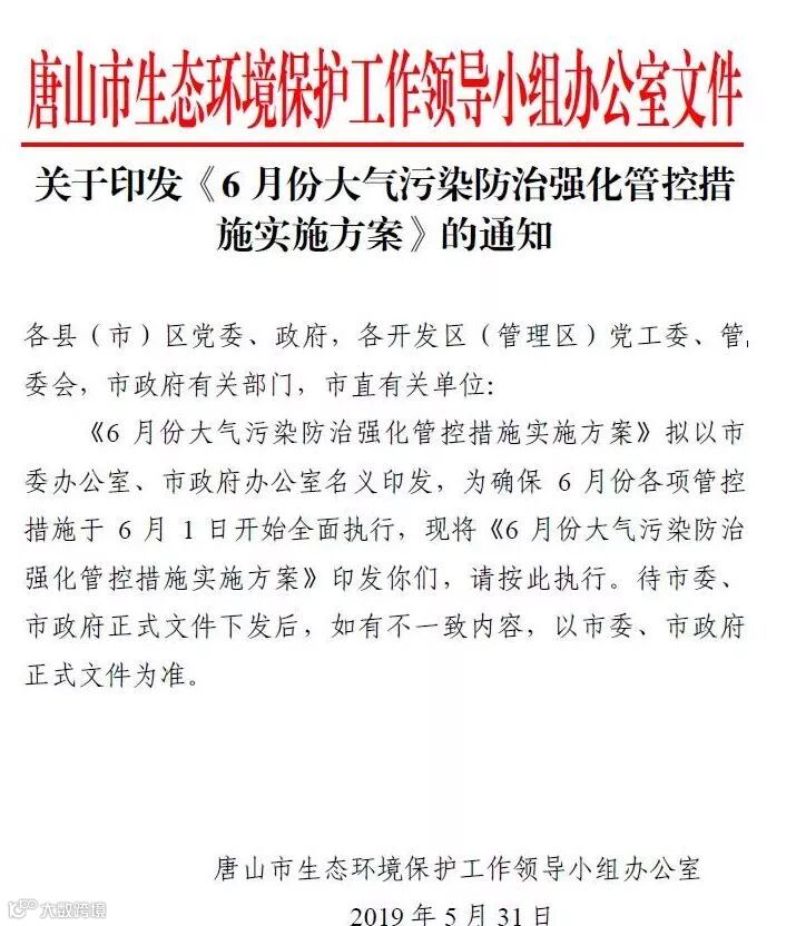 为进一步持续改善全市(唐山市,下同)环境空气质量,确保完成年度大气污染防治目标任务,结合6月份大气扩散条件,经研究制定本方案。
