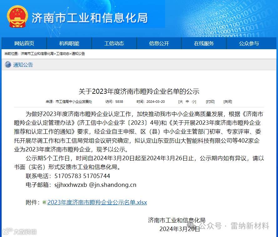 近日,山东雷纳新材料科技有限公司顺利通过2023年度济南市瞪羚企业认定,并在济南市工业和信息化局官网名单中进行了公示。