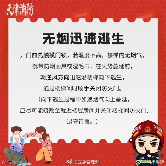 火源在上层时,楼梯内若无烟气,可佩戴简易逃生面罩或用湿毛巾捂住口鼻,迅速沿楼梯向下逃生,通过楼梯间时顺手关闭防火门,切勿乘坐电梯。