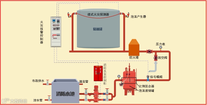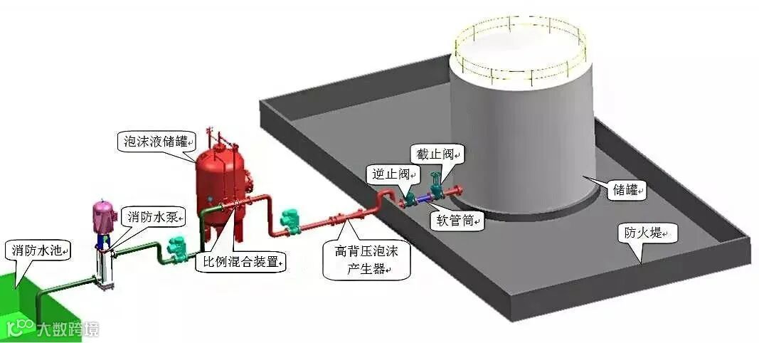 泡沫灭火系统由消防水源、消防泵组、泡沫液供应源、泡沫比例混合器、管路和泡沫产生装置等组成。