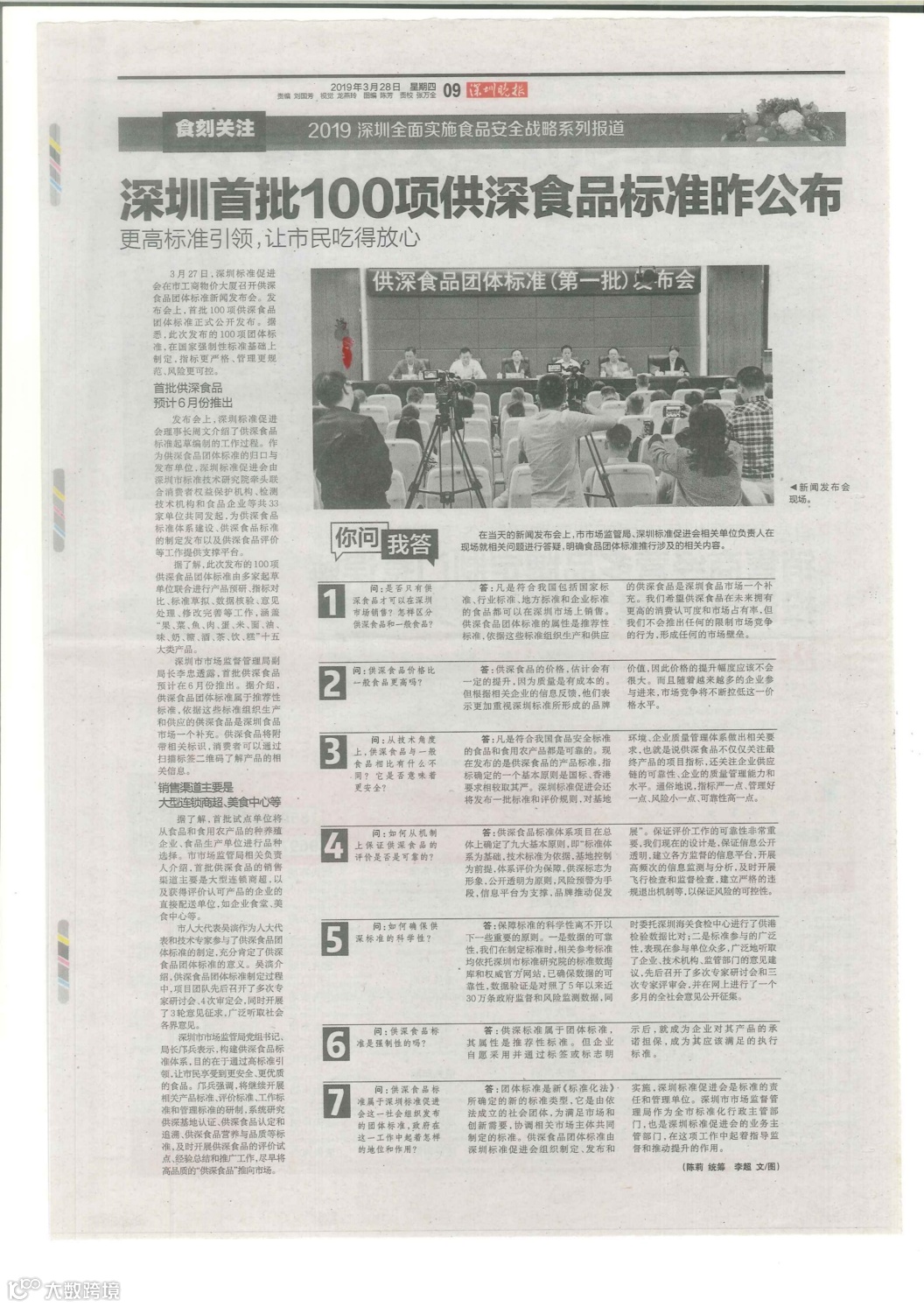 2019年3月27日发布深圳首批100项供深食品标准