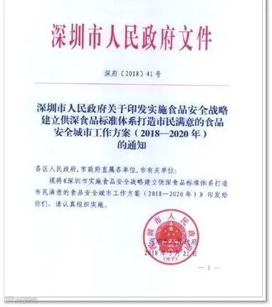 2018年5月21日发布深圳市人民政府办公厅文件【2018】41号:深圳市人民政府关于印发实施食品安全战略建立供深食品标准体系打造市民满意的食品安全城市工作方案(2018-2020年)的通知