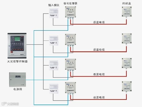 感温电缆采用水平正弦波悬挂敷设的安装方式时,为保证火灾探测的可靠性,感温电缆宜布置在被保护电缆托架或支架的中心位置,当被保护电缆的托架或支架的宽度超过600mm时,宜安装2路感温电缆。感温电缆应通过信号处理器硬接点接入火灾报警系统输入模块。