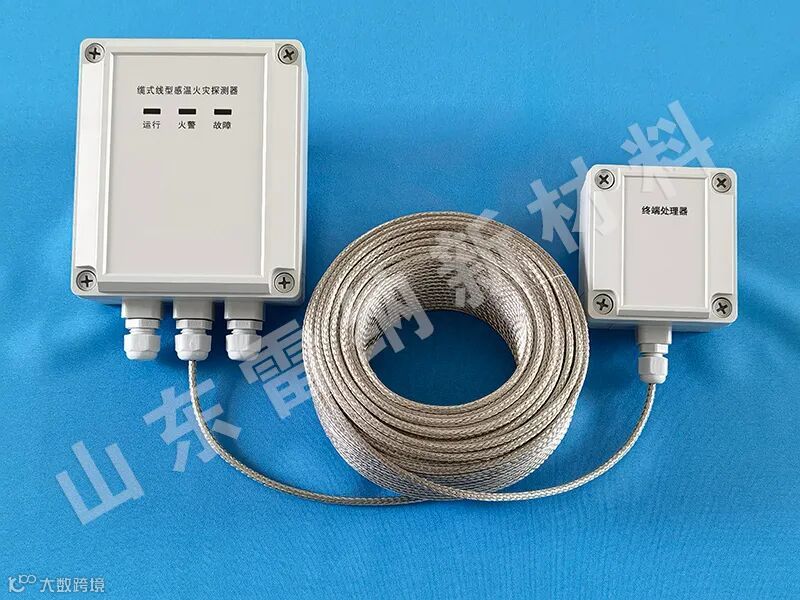 缆式线型感温火灾探测器即感温电缆,感温电缆一般由微机处理器、终端盒和感温电缆组成。感温电缆由两根用热敏材料绝缘的钢丝组成,其探测原理是缆式探测器受热后热敏材料电阻率降低从而触发开关量的温度报警,根据不同的场合选用不同额定动作温度的探测器(一般分为68℃、 88℃、105℃、138℃、180℃五个级别),其敷设方式采用接触性正弦波和围绕式敷设。