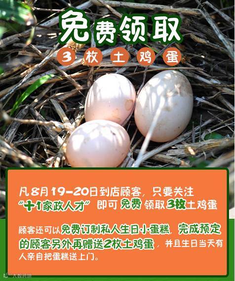 关注+1家政公众号 --> 转发图文至朋友圈 --> 到活动处出示转圈记录 --> 加工作人员活动微信号 --> 接收当日活动符号微信 --> 登记领取鸡蛋1份。