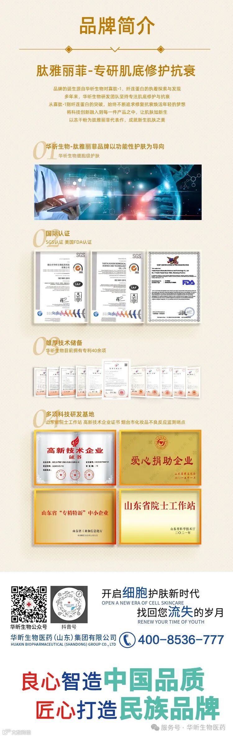 科研创新上,华昕生物拥有多发酵工程、细胞再生多个前沿护肤领域,肽类基因工程、微流控3D打印成像技术、一二三类医疗器械、药食同源食品、特医食品等。公司始终坚持“政产学研金服用”推动公司创新创业共同体的发展,与国内外多家知名高校建立深度合作关系,联合开展课题攻关。成立了国家高层次专家委员会,公司先后荣获国家高新技术企业、省市两级专精特新企业,并设立院士工作站等多项殊荣。尤其是纤连蛋白研发领域,公司已取得了国家发明专利(CN1159760318)和国家原料安全信息,企业通过IS09001质量管理体系、SGS认证、FDA认证,进一步巩固了行业领先地位。