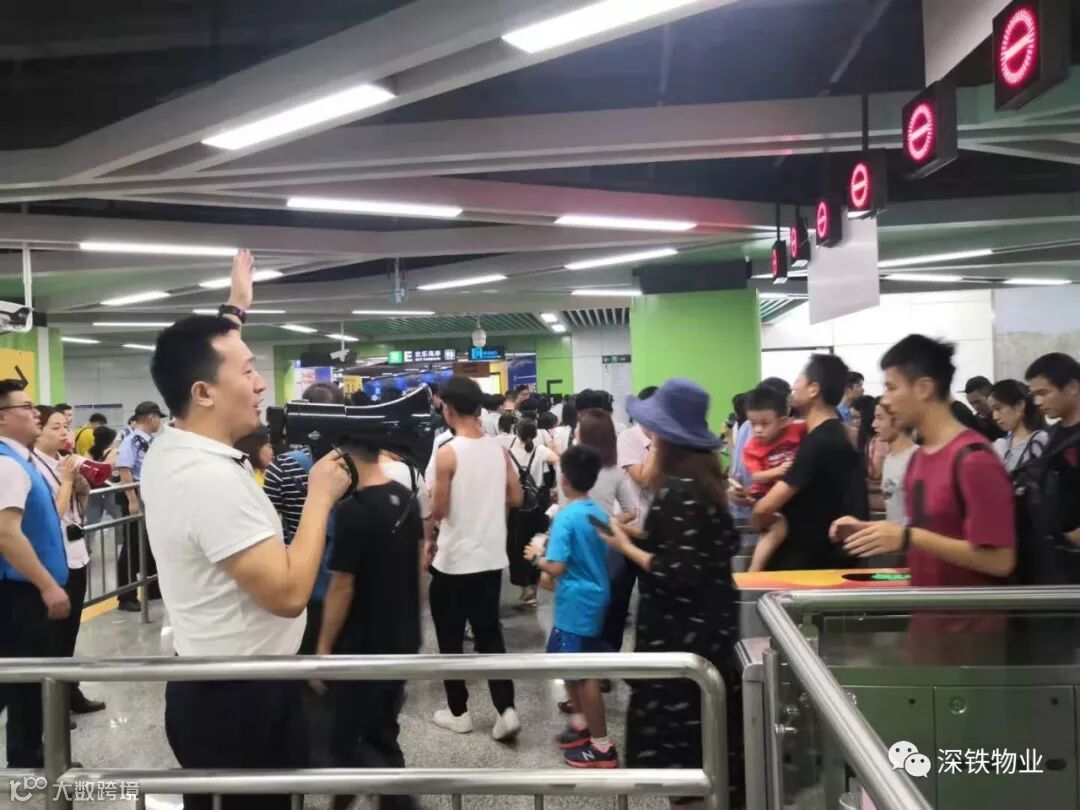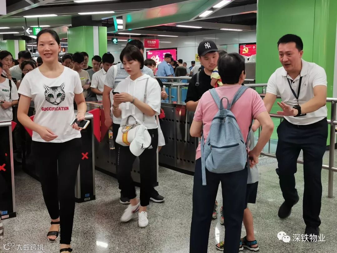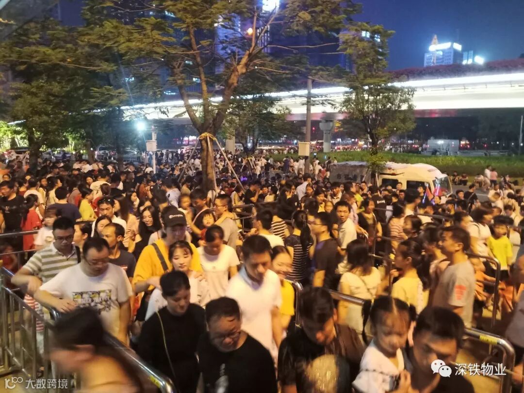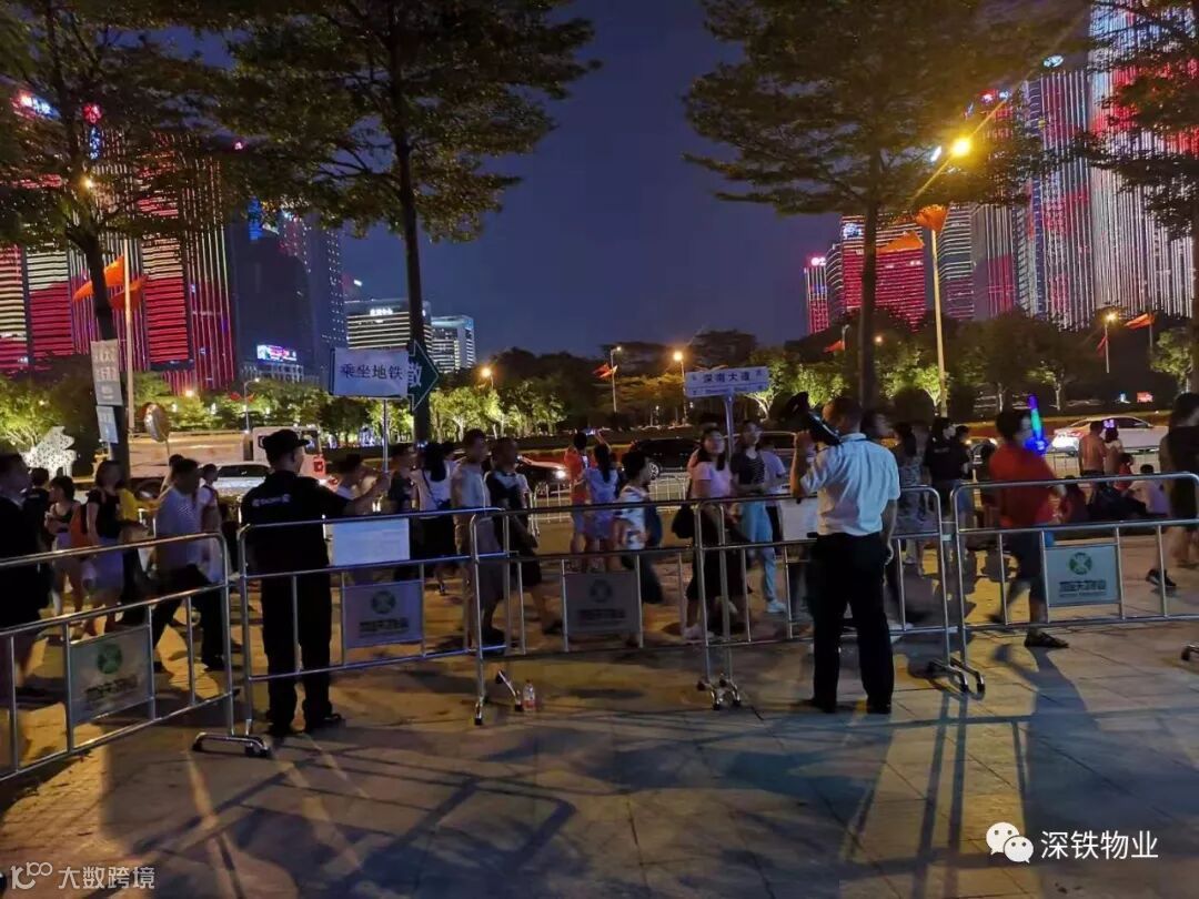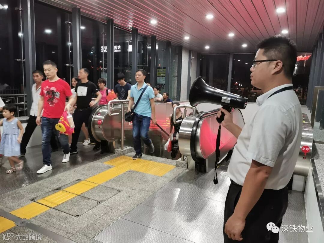 10月1日烟花晚会期间,从灯光秀上演的19时左右开始,大批因无法进入烟花晚会现场及晚会结束后撤离的客流纷纷流转去灯光秀现场,使原本就客流拥挤的福田枢纽交通压力顿时倍增,面对这一情况,现场管理处立即提高应急响应,应急支援队及时参与福田枢纽维护现场秩序。这个时候工作人员总是严密的关注着每一个区域,与深铁运营、运管办等工作人员协力开展交通疏导,及时为有需要的人提供力所能及的帮助,做好区域持续清洁卫生,确保地铁枢纽区域安全、平稳、有序和温馨。