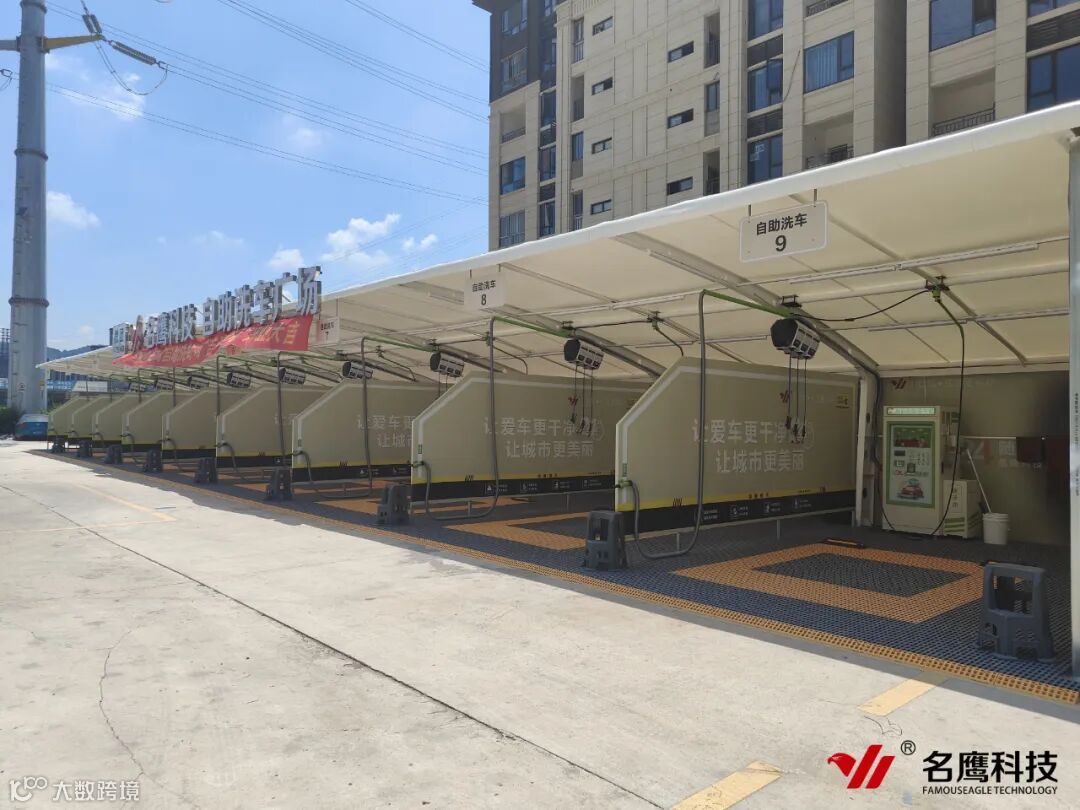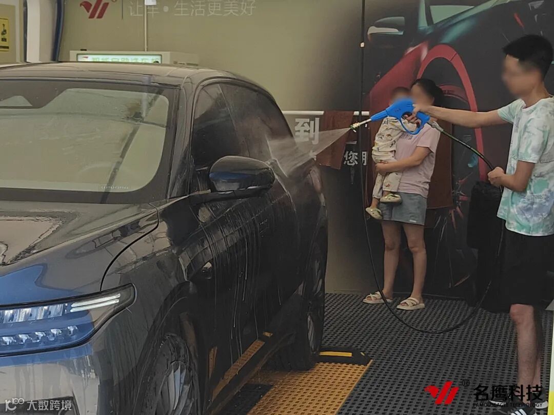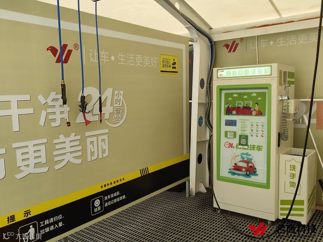 该店配备名鹰科技自研的第三代智慧自助洗车一体机(MYBMv3.0),具备高压清水清洁、智能配比泡沫、镀膜护车等功能,操作简易,新手可快速上手,且实行24小时全天候运营,支持通过小程序扫码洗车,按用量付费。