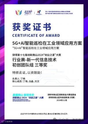 导读:热烈祝贺我司在第十七届创新南山2024“创业之星”大赛中凭借“5G+AI智能巡检在工业领域应用方案”获得行业赛-新一代信息技术初创团队组三等奖。