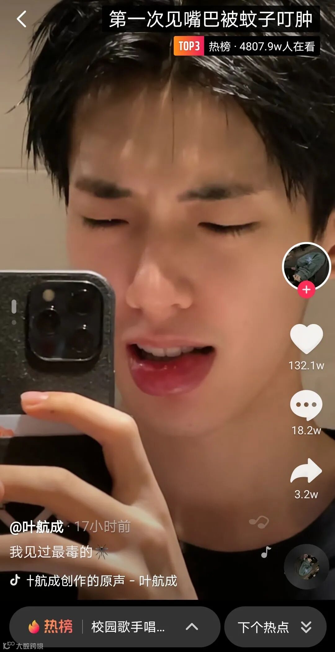 演员叶航成在无锡时,被蚊子叮了一下下巴,结果下嘴唇直接肿成香肠,直呼:我见过最毒的蚊子...