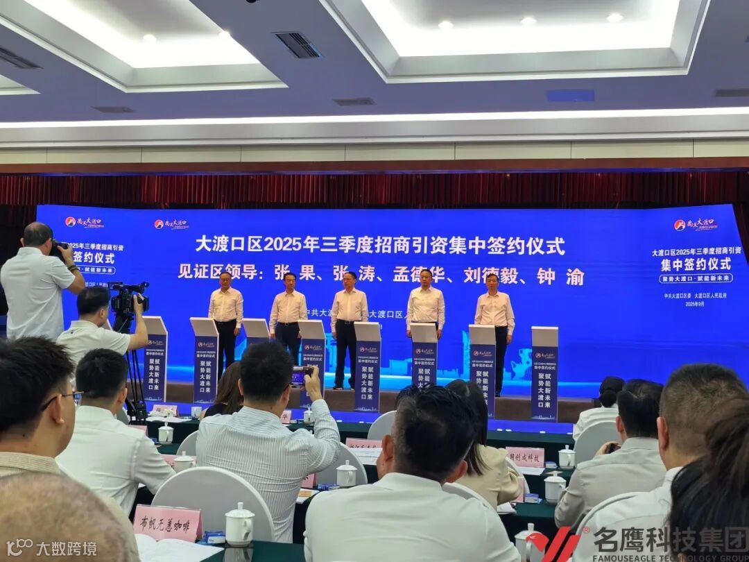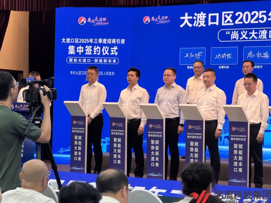 9月25日,在大渡口区委书记张果、区长张涛的共同见证下,名鹰科技集团与重庆大渡口区达成重要战略合作,集团董事长冯前程先生率队出席并签约。名鹰科技集团携1.2亿资金强势入驻,不仅为大渡口区经济高质量发展注入强劲新动能,也标志着双方正式携手,共同开启智慧便民服务的新篇章。
