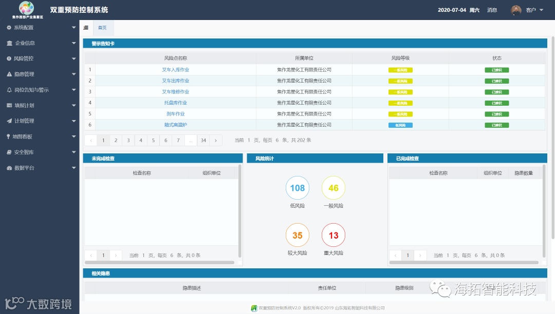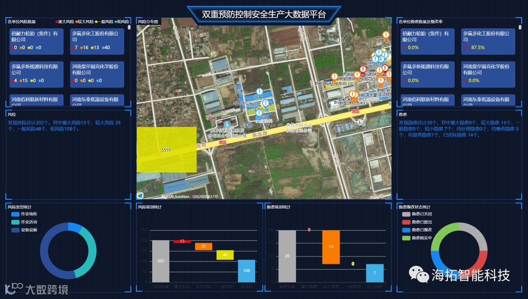 海拓智能双重预防控制管理信息系统是根据《国务院安委会关于实施遏制重特大事故工作指南构建双重预防机制的意见》等政策要求,结合国际先进的安全管理理论方法和企业安全管理的水平,借助互联网、移动通信、物联网、云服务和大数据等技术,研发形成双重预防机制信息化系统,以系统化的安全咨询方案为基础,针对企业安全风险特点,与生产运营对接,动态管控安全风险和隐患排查治理,精准解决风险分级管控和隐患排查治理制度落地、安全生产风险实时监控和科学化决策等难题,有效推进事故预防工作信息化、数字化、动态化,实现企业安全管理的革命性突破。海拓智能积极响应焦作市双重预防体系建设要求,为焦作西部产业园区提供系统支撑。