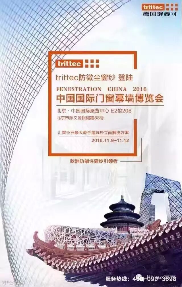 2016年11月9日,德国trittec防雾霾窗纱将登陆中国国际门窗幕墙博览会,大牌斗秀,名品汇集,来北京国际展览中心E2馆208展位,trittec邀您体验美好呼吸。