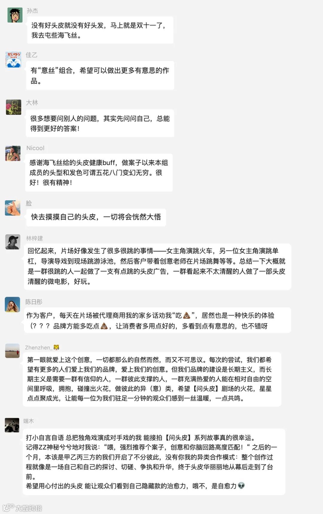 同时我们也发现,往往在洗头时,人们总会思考一些奇怪的问题。在这个时刻,如果能与自己的内心,与另一个自己来一场灵魂对谈解决自身焦虑,再用海飞丝解决头皮的焦虑,岂不是一举两得?于是与头皮人对话的想法就此诞生。我们创造出一个清醒的,睿智的,有点神秘的头皮智者形象,毕竟ta可是用过海飞丝的头皮嘛。于是就有了最后的slogan:清爽头皮,清醒人生。也有了后来#头皮才是人间清醒 的话题。