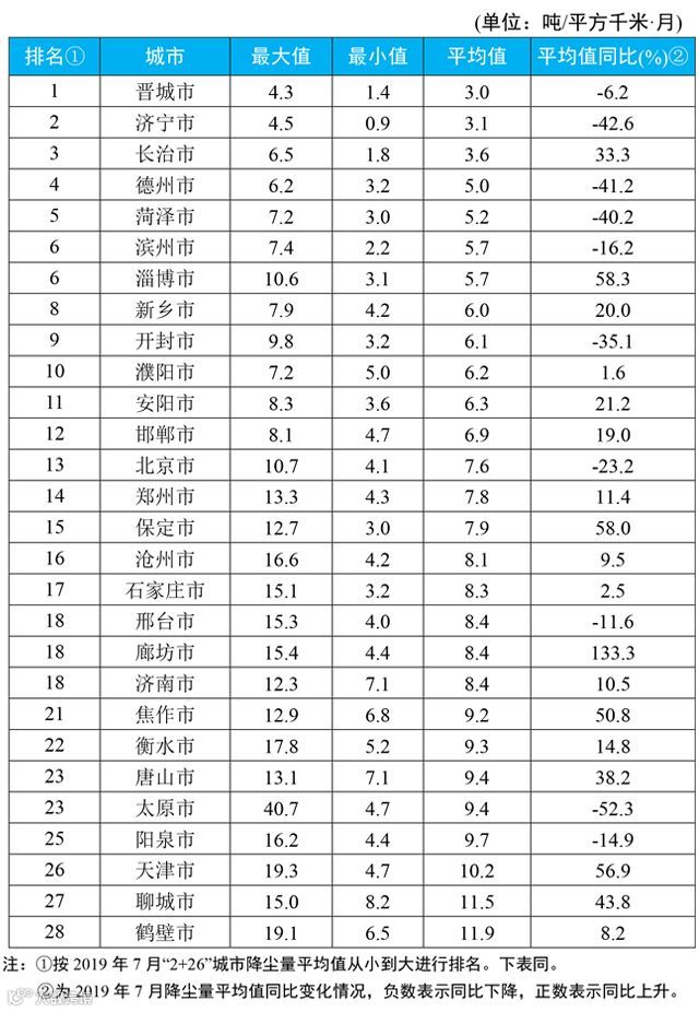 生态环境部今日向媒体公布了2019年7月京津冀大气污染传输通道“2+26”城市(以下简称“2+26”城市)和汾渭平原11城市降尘监测结果。