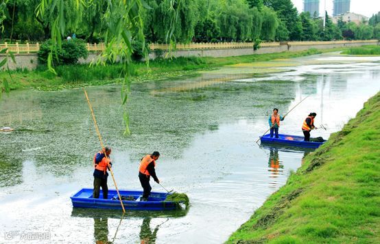 安徽省淮北市老濉河,工作人员在打捞河道内的漂浮物。(人民视觉)