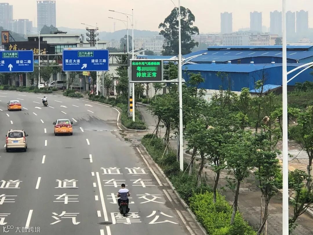 ▲在广东江门,当车辆经过检测车道时,LED显示屏就会实时显示车牌号以及车辆尾气排放情况。