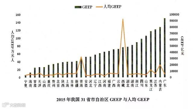 ▲2015年我国31个省市区GEEP与人均GEEP。资料来源:《中国经济生态生产总值核算发展报告2018》
