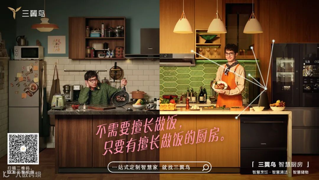 所以片中我们呈现了“社杂女婿”与“社牛岳父岳母”两种看似对立的角色,一是为了唤起更广泛的共鸣,上一辈人经历过更多集体生活和工作的锤炼,确实更社牛。二是两种角色作为一家人表达爱的方式会冲突,他们都爱家,但爱的方式需要找到更智慧的表达。让不同性格的两代人过到一起才是“定制智慧家”的意义所在。
