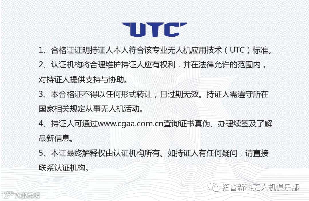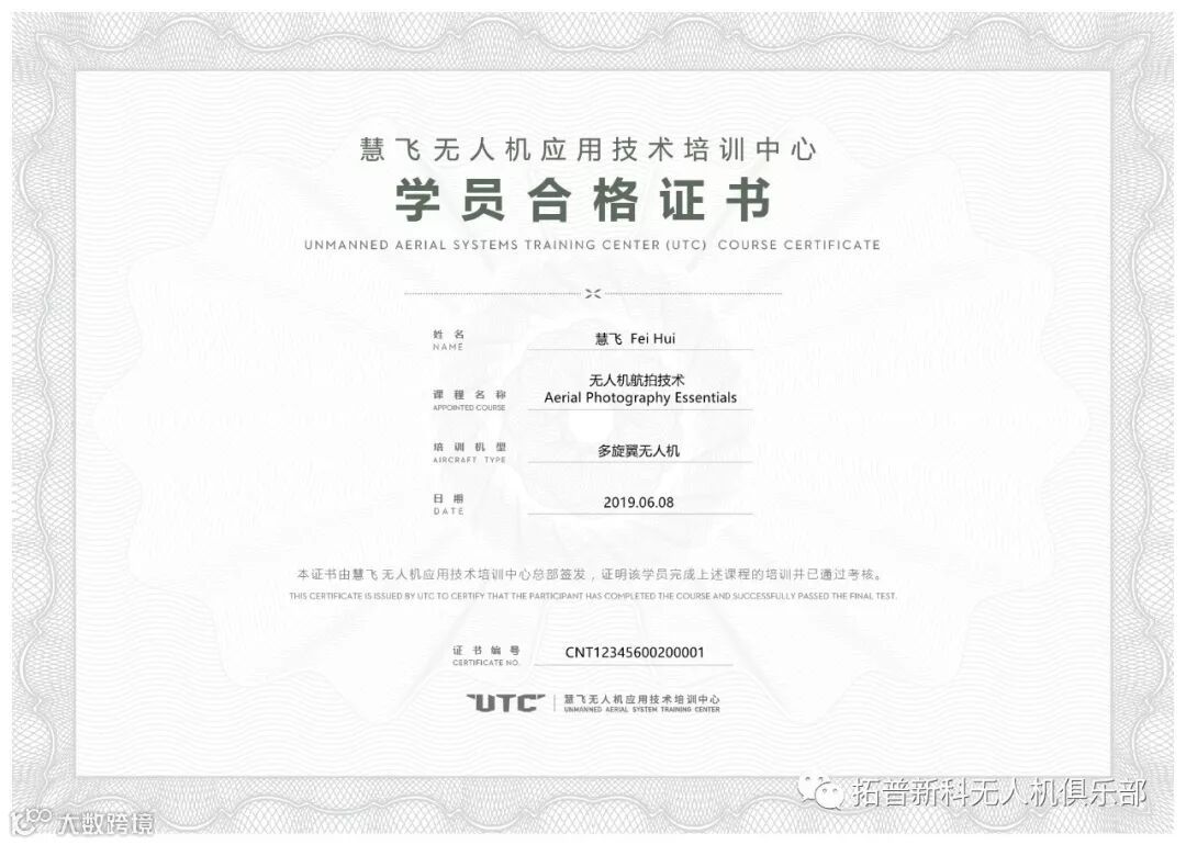 结束后,通过考核的学员将获得由慧飞颁发的《慧飞学员合格证书》,以及由中国航空运输协会通用航空分会、中国成人教育协会联合颁发的《UTC无人驾驶航空器系统操作手合格证》。